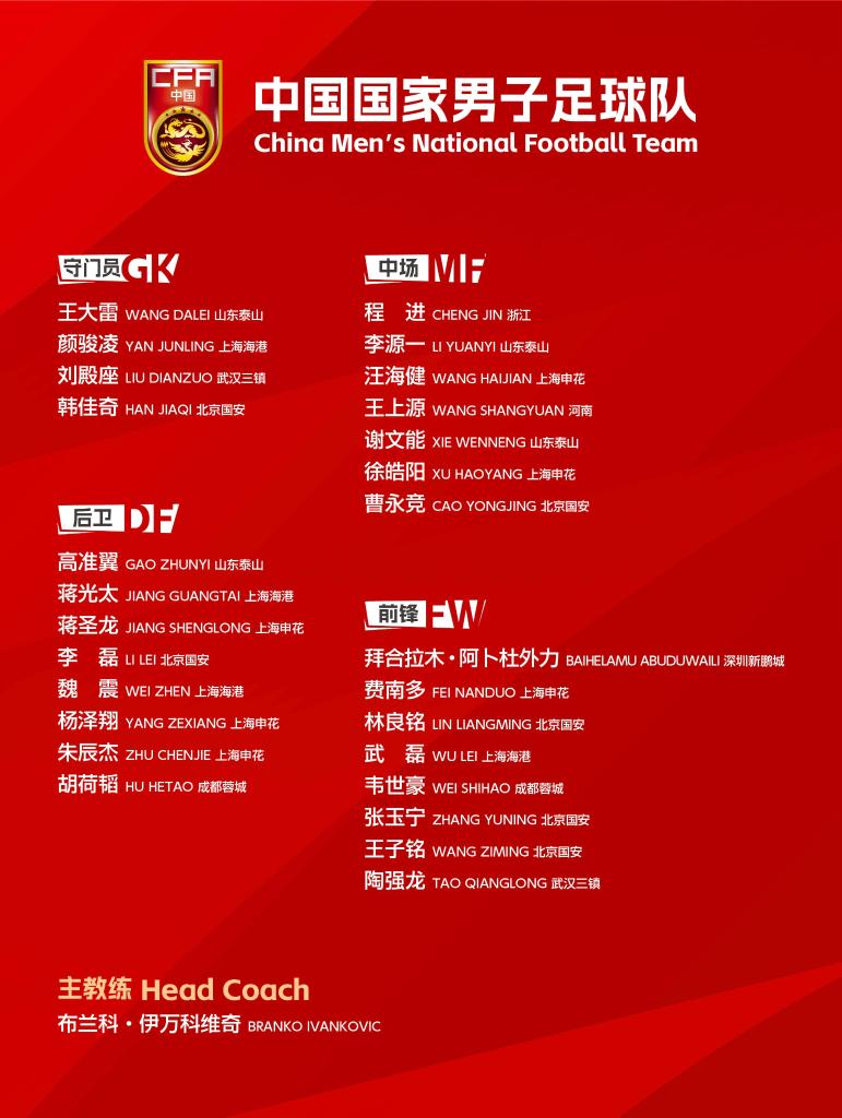 以下為國足本期27人大名單: