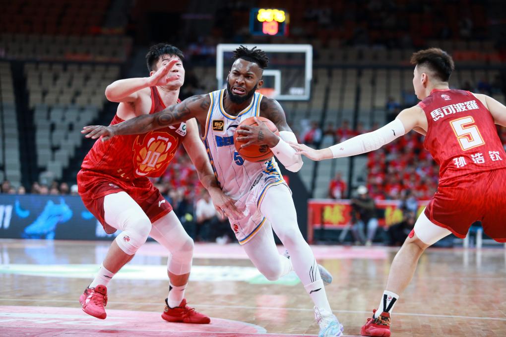 11月29日,北京隊(duì)球員杰曼(中)在比賽中帶球突破。新華社發(fā)(彭志剛攝)