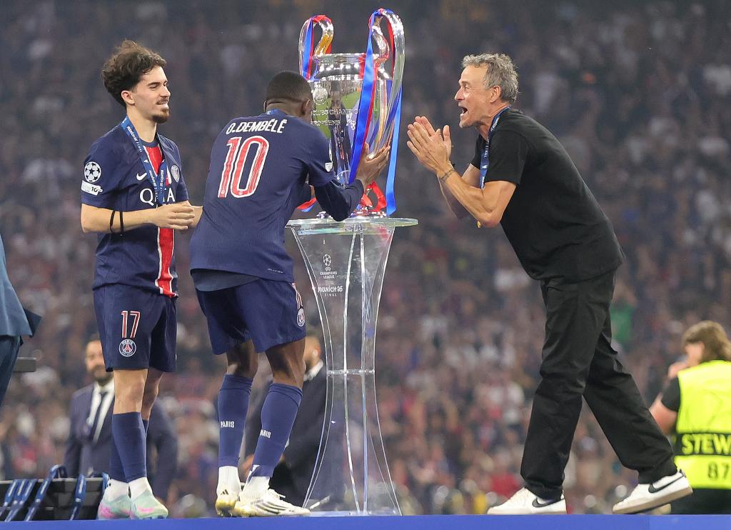 5月31日,巴黎圣日耳曼隊主教練恩里克(右)與球員登貝萊(中)、維蒂尼亞慶祝。當日,在德國慕尼黑進行的2024-2025賽季歐冠聯(lián)賽決賽中,法甲巴黎圣日耳曼隊5比0擊敗意甲國際米蘭隊,收獲隊史第一座歐冠冠軍獎杯。新華社發(fā)(菲利普·魯伊茲攝)