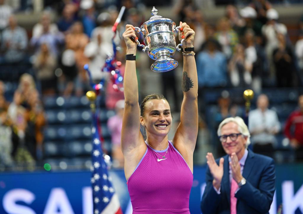 2024年9月7日,薩巴倫卡在頒獎儀式上高舉獎杯。當(dāng)日,在2024美國網(wǎng)球公開賽女子單打決賽中,白俄羅斯選手薩巴倫卡2比0戰(zhàn)勝美國選手佩古拉,獲得冠軍。新華社記者 李睿 攝