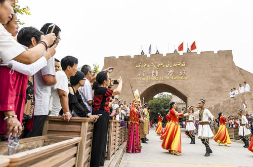 在新疆喀什古城景區(qū)“開(kāi)城”儀式上,游客在觀(guān)看歌舞表演(2019年8月13日攝)。新華社記者 王菲 攝