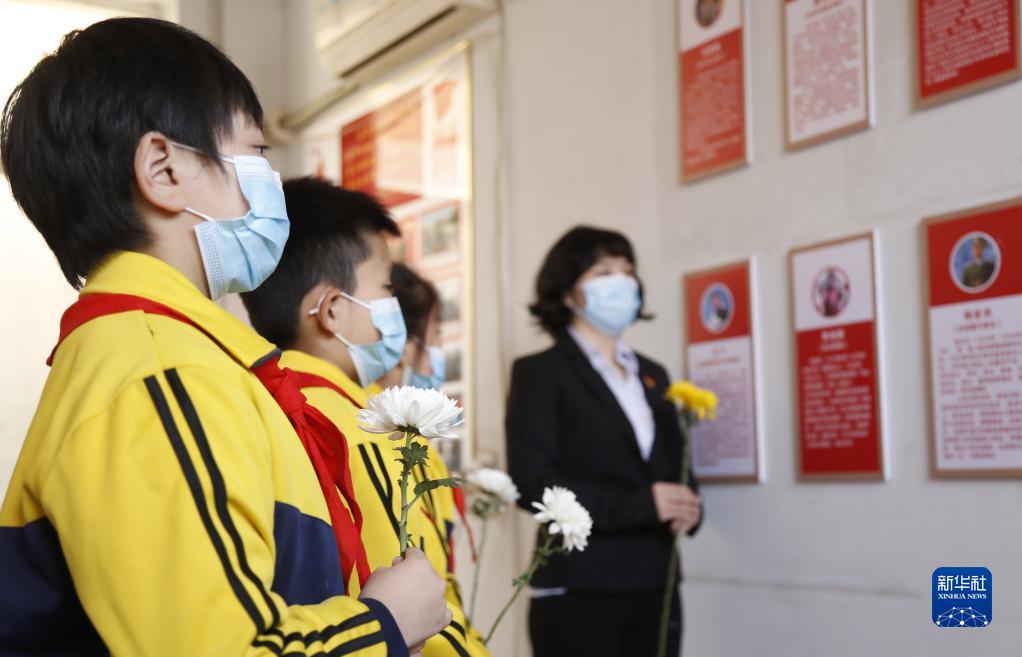 4月4日,在河北省邢臺市襄都區(qū)東郭村鎮(zhèn)北陳村社區(qū)英烈事跡館,學生敬獻鮮花緬懷先烈。