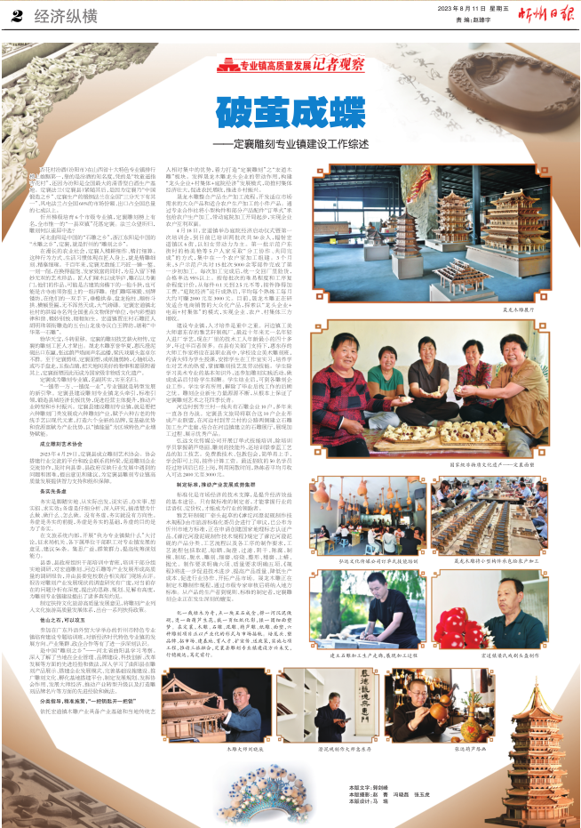 定襄民間有悠久的雕刻傳統(tǒng),歷史上無(wú)數(shù)能工巧匠以雕刻為生,留下了如五臺(tái)山龍泉寺石牌坊等雕刻極品,創(chuàng)造了獨(dú)具特色的定襄雕刻文化。現(xiàn)在,木雕、石雕、泥雕(澄泥硯)、葫蘆雕、紙雕(剪紙、戲劇頭盔)、面塑6種雕刻門(mén)類(lèi)的手藝人活躍在民間,他們當(dāng)中的佼佼者,影響遍及宇內(nèi)、產(chǎn)品行銷(xiāo)全國(guó)。定襄縣建設(shè)雕刻專(zhuān)業(yè)鎮(zhèn),就是要把這6種雕刻門(mén)類(lèi)發(fā)展成6種雕刻產(chǎn)業(yè),賦予6種古老的傳統(tǒng)手藝以現(xiàn)代元素,打造6個(gè)全新的品牌,變基礎(chǔ)優(yōu)勢(shì)和資源稟賦為產(chǎn)業(yè)優(yōu)勢(shì),以“鎮(zhèn)能量”為區(qū)域特色產(chǎn)業(yè)增勢(shì)賦能。