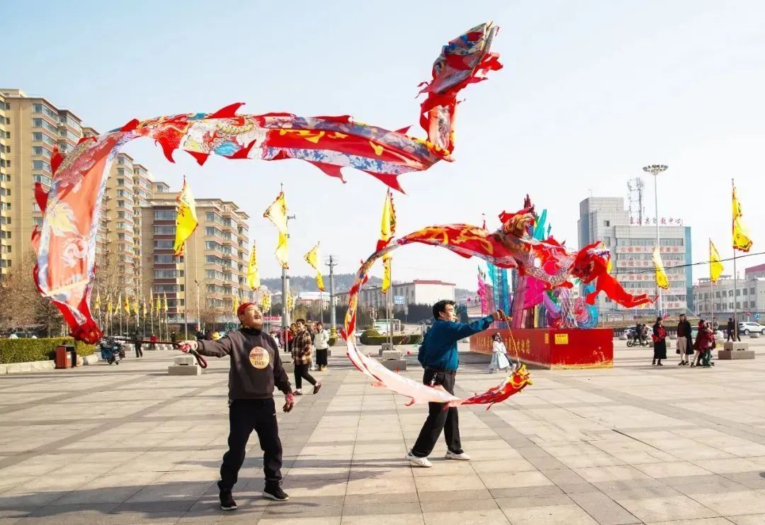 市民在襄汾縣鑼鼓廣場舞動(dòng)龍綢慶祝龍年