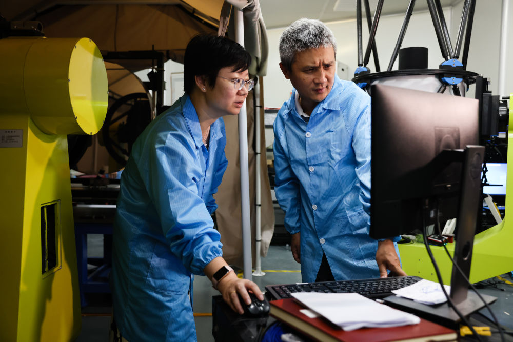 在中國科學技術大學上海研究院實驗室,印娟(左)和同事在查看實驗數據(2023年7月22日攝)。新華社記者 金立旺 攝