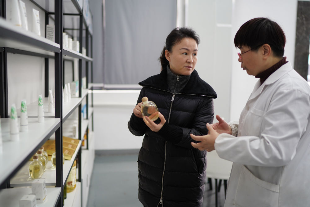明經華(左)在位于江西贛州市章貢區(qū)的贛州哈克生物科技有限公司調研油茶深加工產業(yè)(2023年2月24日攝)。新華社記者 周密 攝