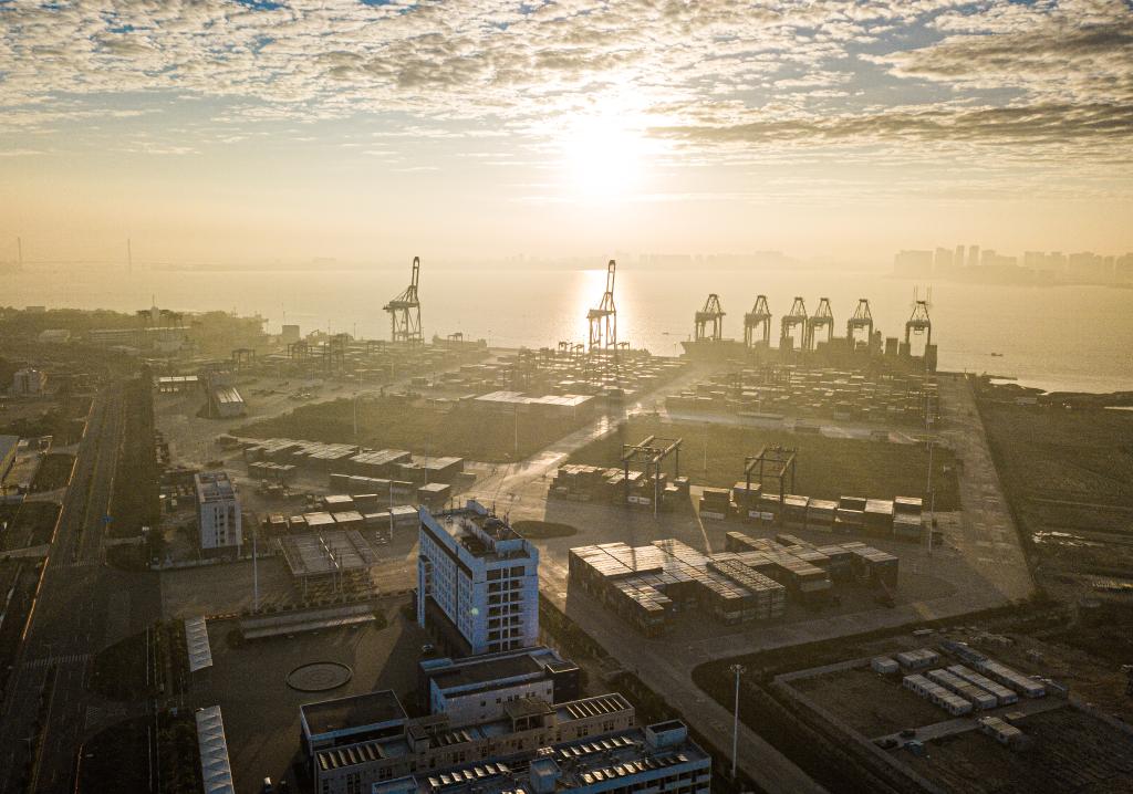 2024年1月1日在海南省洋浦經(jīng)濟(jì)開發(fā)區(qū)拍攝的海南自貿(mào)港集裝箱航運(yùn)樞紐——洋浦國(guó)際集裝箱碼頭(無(wú)人機(jī)照片)。新華社記者 蒲曉旭 攝