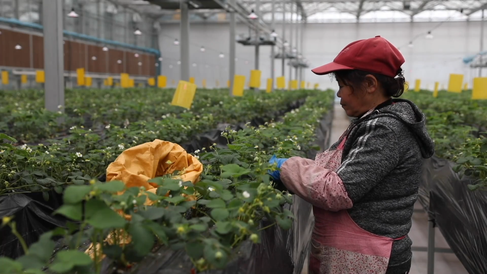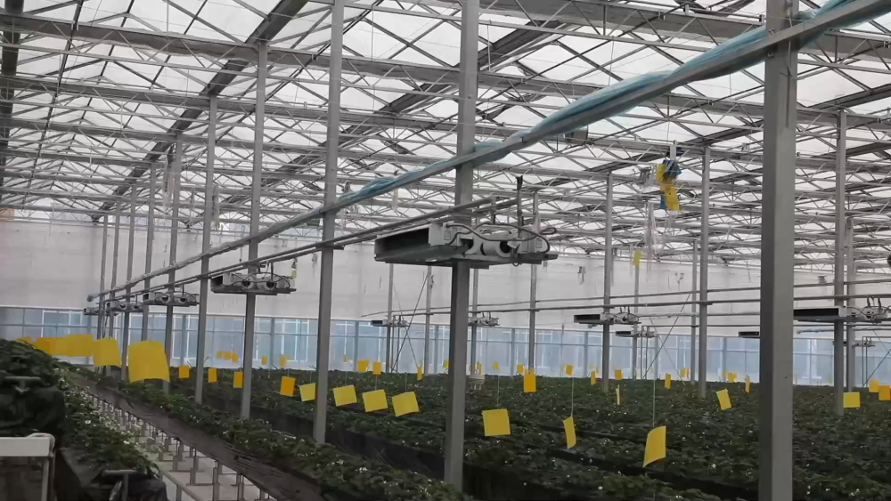 智慧農(nóng)場玻璃溫室現(xiàn)共種植三個(gè)品種、八萬株草莓,均為自主繁育的草莓苗??茖W(xué)種植促進(jìn)了豐產(chǎn),兩座玻璃溫室均可實(shí)現(xiàn)一年四季連續(xù)生產(chǎn)。