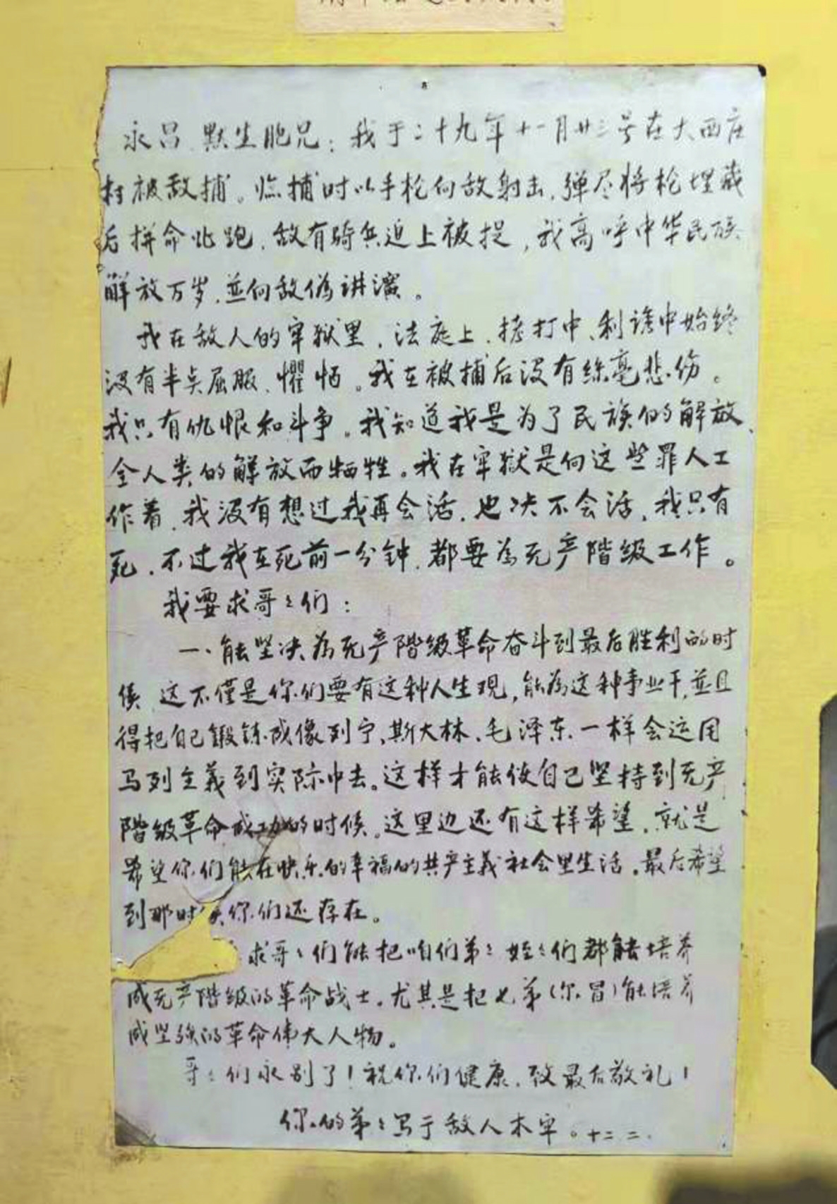 金方昌烈士遺書(shū) 編者按: 在紀(jì)念中國(guó)人民抗日戰(zhàn)爭(zhēng)暨世界反法西斯戰(zhàn)爭(zhēng)勝利80周年之際,為緬懷抗戰(zhàn)英烈,賡續(xù)紅色血脈,本刊特選登忻州籍和在忻州大地上壯烈犧牲的抗日英烈家信遺墨,以表達(dá)對(duì)他們的深切緬懷與崇高敬意。這些珍貴的抗戰(zhàn)英烈遺書(shū)(家信)雖遺墨有限,卻字字千鈞。今天,重讀這些珍貴的信箋,我們依然能深切感受到烈士們熾熱的家國(guó)情懷:當(dāng)年忻州大地上硝煙彌漫、烽火連天的壯烈場(chǎng)景仿佛重現(xiàn),抗戰(zhàn)英烈們對(duì)民族解放事業(yè)必勝的堅(jiān)定信念,依舊震撼人心。 續(xù)范亭 續(xù)范亭,名培模,字范亭,崞縣(今原平市)西社村人。1909年加入同盟會(huì),參與辛亥革命忻代寧公團(tuán)北伐,后投身討袁護(hù)國(guó)軍、靖國(guó)軍等反軍閥斗爭(zhēng)。1935年12月,因蔣介石消極抗日,在南京中山陵剖腹明志,寫(xiě)下絕命詩(shī),經(jīng)搶救脫險(xiǎn)。抗戰(zhàn)爆發(fā)后,任第二戰(zhàn)區(qū)高級(jí)參議、戰(zhàn)動(dòng)總會(huì)主任委員,后任暫1師師長(zhǎng)、晉西北行政公署主任、山西新軍總指揮、晉綏軍區(qū)副司令員。1947年9月12日病逝,中共中央追認(rèn)他為中國(guó)共產(chǎn)黨黨員。 遺書(shū)導(dǎo)讀 遺書(shū)核心分三層:一是思想轉(zhuǎn)變歷程,回顧從參加辛亥革命到信奉共產(chǎn)主義,認(rèn)識(shí)到唯有中共領(lǐng)導(dǎo)的革命道路能實(shí)現(xiàn)民族和人民徹底解放;二是說(shuō)明未早申請(qǐng)入黨緣由,因久病臥床,此前“屢欲請(qǐng)求入黨”而未提;三是明確入黨請(qǐng)求,“在此彌留之際,以畢生至誠(chéng)敬謹(jǐn)請(qǐng)求入黨”。 續(xù)范亭將軍隨時(shí)代進(jìn)步不斷更新觀念,決裂舊思想舊勢(shì)力,由舊式軍人成長(zhǎng)為堅(jiān)定的共產(chǎn)主義斗士,其臨終執(zhí)著追求入黨的赤誠(chéng),彰顯對(duì)黨的忠誠(chéng)與對(duì)共產(chǎn)主義的堅(jiān)定信仰,是舊式軍人轉(zhuǎn)變?yōu)楦锩肥康牡湫汀?/p> 烈士遺書(shū) 敬愛(ài)的毛主席和中共中央: 范亭自辛亥以來(lái),即摸索為民族和人民解放的真理,奮勇前行,在幾經(jīng)波折之后,終于認(rèn)清了只有中國(guó)共產(chǎn)黨領(lǐng)導(dǎo)的革命道路,才是中華民族和中國(guó)人民徹底解放的道路。七七抗戰(zhàn)之后,即欣然接受領(lǐng)導(dǎo),參加晉西北抗日民主根據(jù)地的抗戰(zhàn)建設(shè)工作,想從此更好為人民服務(wù),以償平生夙愿。 孰料范亭方奮力以赴之時(shí),竟以身染重病,去延休養(yǎng)。在延數(shù)年,蒙黨百般愛(ài)護(hù),尤覺(jué)欣幸者,得以時(shí)常聆聽(tīng)毛主席和中共中央的教導(dǎo),范亭奮斗一生,始于今日目睹解放區(qū)廣大人民的真正翻身,真正看見(jiàn)了新中國(guó)的光明前途,每自不禁感奮,熱淚奪眶而出。屢欲請(qǐng)求入黨,做一名革命軍的馬前卒,以終余年,但以久病床褥,迄未提出。 現(xiàn)范亭已病入膏肓,恨不能親睹賣(mài)國(guó)賊蔣介石集團(tuán)之行將受審,美帝國(guó)主義之滾蛋,與全中國(guó)人民之徹底解放,是為憾耳。范亭數(shù)年來(lái)愧無(wú)貢獻(xiàn),然追求真理之志未嘗一日或懈也。 在此彌留之際,我以畢生至誠(chéng)敬謹(jǐn)請(qǐng)求入黨,請(qǐng)中共中央嚴(yán)格審查我的一生歷史,是否合格,如承追認(rèn)入黨,實(shí)平生之大愿也,專此謹(jǐn)致布爾塞維克的敬禮! 續(xù)范亭 1947年9月 郝夢(mèng)齡 郝夢(mèng)齡,河北藁城莊合村人,畢業(yè)于保定陸軍軍官學(xué)校。早年投效奉軍,后隨部歸屬馮玉祥國(guó)民革命軍,歷任旅長(zhǎng)、師長(zhǎng)、國(guó)民革命軍第九軍軍長(zhǎng)等職。1937年抗戰(zhàn)全面爆發(fā)后,他率部由貴州北上,抵達(dá)忻口前線,指揮部隊(duì)守衛(wèi)龍王堂、南懷化等主陣地。忻口戰(zhàn)役打響后,他親臨一線阻擊日軍。10月16日凌晨,為鞏固陣地,追擊日軍時(shí)不幸中彈犧牲。殉國(guó)后,中華民國(guó)國(guó)民政府追授其陸軍上將軍銜;1983年,民政部追認(rèn)其為革命烈士;2014年,被列入民政部公布的第一批著名抗日英烈和英雄群體名錄。 遺書(shū)導(dǎo)讀 1937年9月15日,郝夢(mèng)齡途經(jīng)武漢回家時(shí)寫(xiě)遺囑,叮囑女兒郝慧英“二十七年(1938年)拆”。15歲的郝慧英搶信欲拆,被父親撕掉丟進(jìn)痰盂,她撈出拼好方知是遺囑。郝夢(mèng)齡對(duì)兒女說(shuō):“我愛(ài)你們,但更愛(ài)我們的國(guó)家?,F(xiàn)在敵人屠殺同胞,大家都應(yīng)該去殺敵人。國(guó)家亡了,你們也沒(méi)有好日子過(guò)了?!?/p> 1937年10月10日,忻口戰(zhàn)役前線,他致信妻子劇紉秋:“此次抗戰(zhàn)乃民族國(guó)家生存之最后關(guān)頭。抱定犧牲決心,不能成功即成仁。為爭(zhēng)最后勝利,使中華民族永存世上,故成功不必在我,我先犧牲?!毙懦珊蟮诹?,郝夢(mèng)齡壯烈殉國(guó)。 烈士遺書(shū) 郝夢(mèng)齡將軍遺書(shū)(1937年9月15日于武漢) 此次北上抗日,吾已抱定犧牲。萬(wàn)一陣亡,你等要聽(tīng)母親的調(diào)教,孝順汝祖母。關(guān)于你等上學(xué),我個(gè)人是沒(méi)有錢(qián),將來(lái)國(guó)家戰(zhàn)勝,你等可進(jìn)遺族學(xué)?!粲诨塾?、慧蘭、蔭槐、蔭楠、蔭森五兒,父留于一九三七年九月十五日。 郝夢(mèng)齡將軍遺書(shū)(1937年10月10日于山西忻口